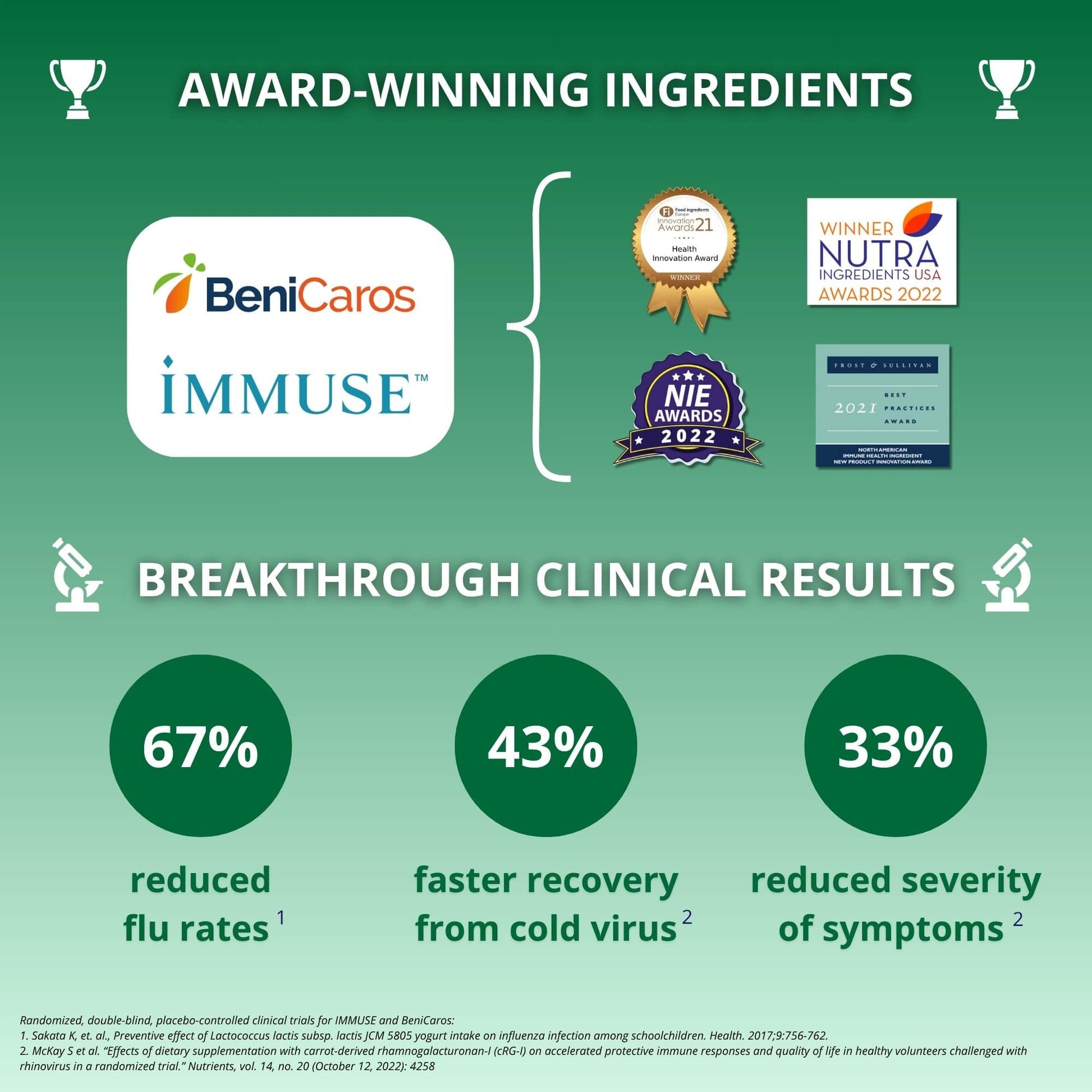 Proven Science: We use award-winning ingredients (BeniCaros® prebiotic, IMMUSE® postbiotic) backed by 35 clinical studies that provide breakthrough results for immune and gut health. Read about our ingredients and science here.